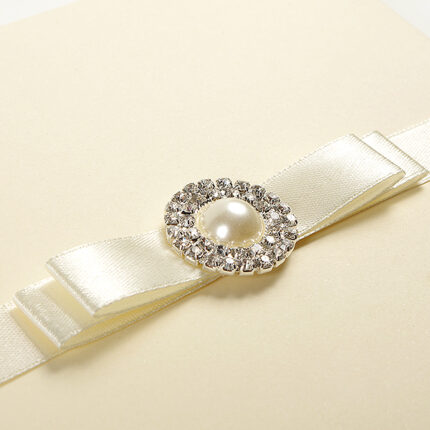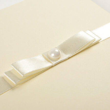 Коробочки кольору айворі з матового дизайнерського картону для запрошень прикрашені атласною стрічкою і бантом з коробочкою в тон і перлиною.