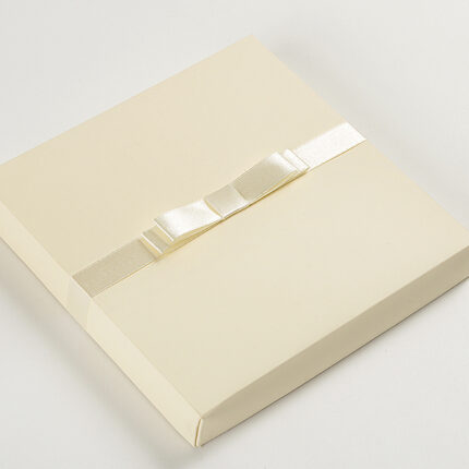 Коробочки кольору айворі з матового дизайнерського картону для запрошень прикрашені атласною стрічкою та бантом у тон коробочці.