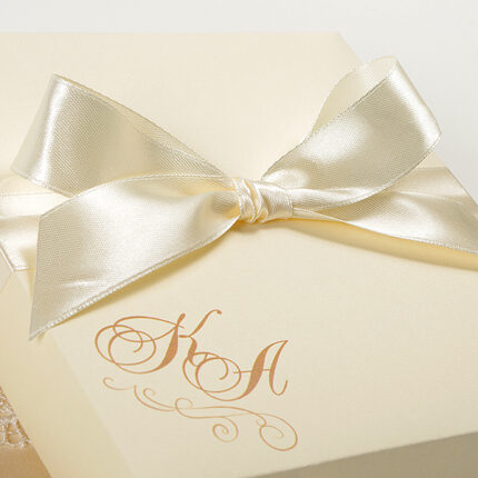 Коробочки кольору айворі з матового дизайнерського картону для запрошень прикрашені атласною стрічкою-бантом у тон коробочці та монограмою.