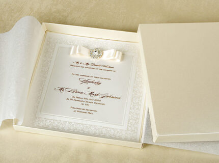 Коробочки для запрошень з перламутрового світло-срібного, майже білого дизайнерського картону, прикрашені монограмою.