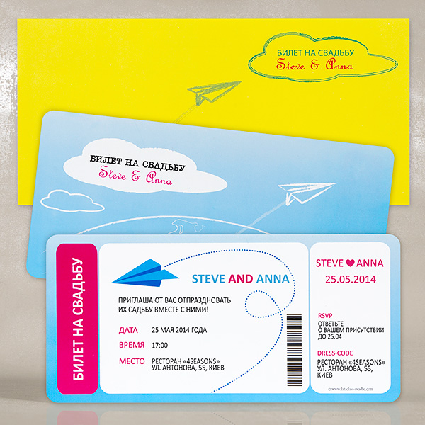 Пропонуємо Вам ще одну версію весільного запрошення у стилі авіа-квитка. У цьому варіанті ми використовували яскраві фарби і сміливі лихі завитки від літака кохання, що пронісся! Цей варіант для веселих та сміливих молодят, які переживають яскраві емоції від майбутньої події!