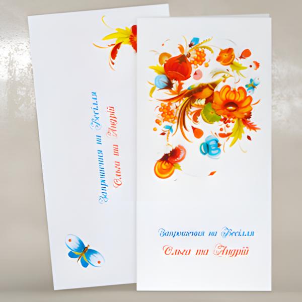 Перед Вами приглашення в українському національному стилі. Чарівна Жар-птиця виконана в дуже привабливій манері Петриківського розпису. Зверніть увагу, що національну тему розкрито дуже не банально. Вас та Ваших гостей неодмінно зачарує ця казкова та позитивна листівка! Конверт може бути будь-якого кольору!
