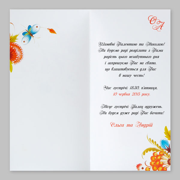 Зверніть увагу, що друк імен гостей у розділах Прикольні, Недорогі, Запрошення з фото та Запрошення на весілля у національному стилі здійснюється за додаткову плату (+2 грн. до листівки), текст без імен – швидко і безкоштовно.
