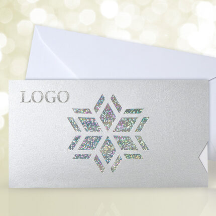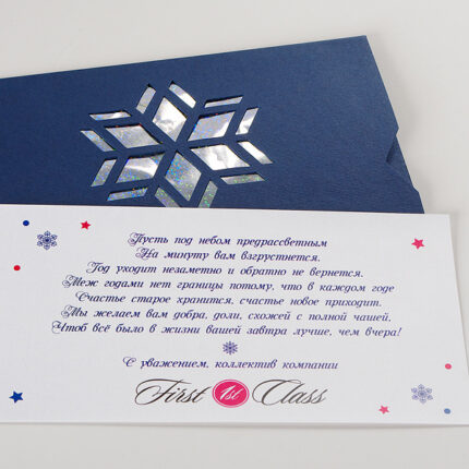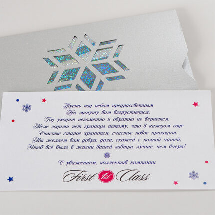 Для розміщення логотипу передбачено оригінальний виріз у формі півсфери на нижній фронтальній частині листівки. Друк вітального тексту виконується на внутрішньому подвійному вкладиші. Кольорова палітра даної колекції новорічних корпоративних листівок досить різноманітна, що дозволяє підібрати варіант, що найбільш поєднується, з логотипом Вашої компанії.