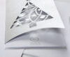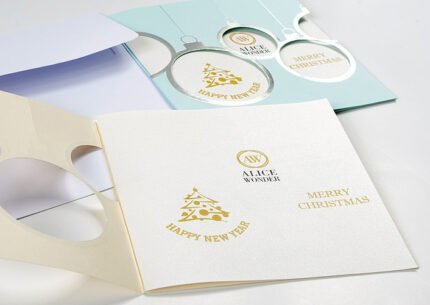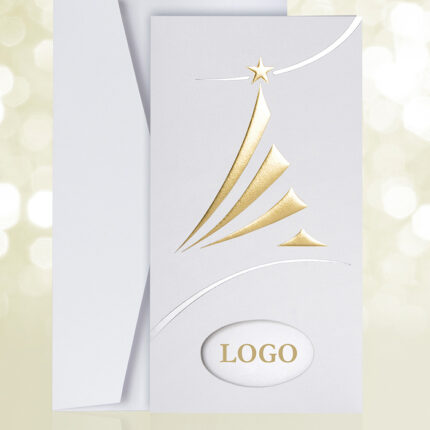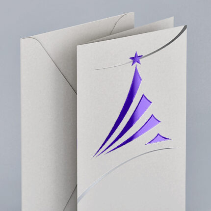 Наш каталог новорічних листівок продовжує тішити колекцією під назвою Christmas-tree. Надзвичайно витончені ажурні ялинки, прикрашені іграшками, філігранно виконані за допомогою лазерної висікання. Листівка із щільного дизайнерського картону, складається “книжечкою”. Розсип зірок та ялинкові іграшки зроблені з ефектами тиснення та нанесенням вибіркової фольги, що надає листівці розкоші та блиску.