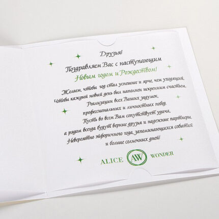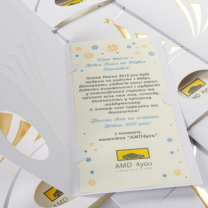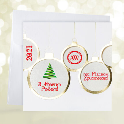 У вартість листівки не входить вартість конверта, друку на листівці, вкладці та конверті. Докладніше про види друку та вартість друку та тиснення логотипу фольгою можна дізнатися тут: Друк на новорічних корпоративних листівках.