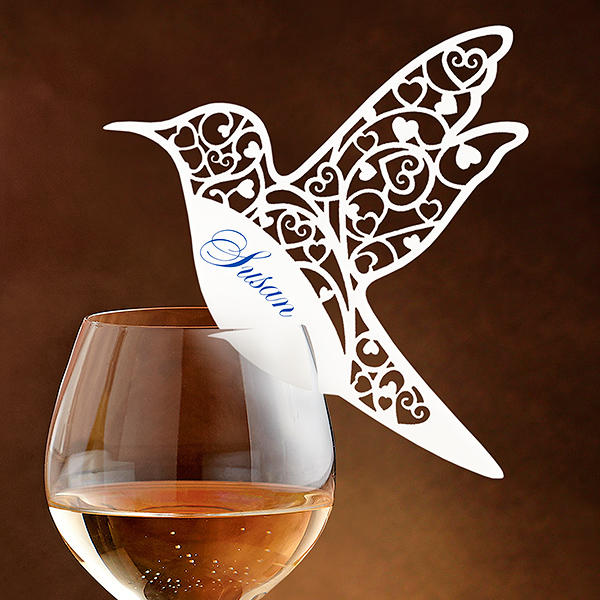 Представляємо вашій увазі найвитонченіші посадкові картки. Незвичайна картка, виконана у формі колібрі, чудово прикрасить весільний стіл. Філігранна лазерна висічка виконана на найвищому рівні. Використовується щільний дизайнерський папір. Імена гостей ви самостійно вписуєте на животику пташки.