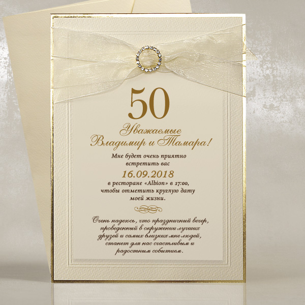 Ця розкішна багатошарова ювілейна листівка – прикраса нашої ексклюзивної Luxury Collection. Основний шар виконаний з щільного дизайнерського картону (товщиною 1,5 мм) з легкою фактурою льону. Краї листівки прикрашені золотою облямівкою із фольги. Листівка виготовлена ​​з текстурного кремового паперу з витісненим обрамленням. Стильний дизайн вітального доповнений вишуканими стразами на пряжці та стрічкою з органзи кремового кольору. Текст друкується на напівпрозорій матовій кальці. Кремовий текстурний конверт додається.