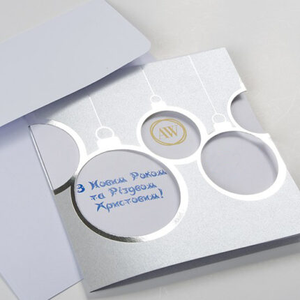У вартість листівки не входить вартість конверта, друку на листівці, вкладці та конверті. Докладніше про види друку та вартість друку та тиснення логотипу фольгою можна дізнатися тут: Друк на новорічних корпоративних листівках.