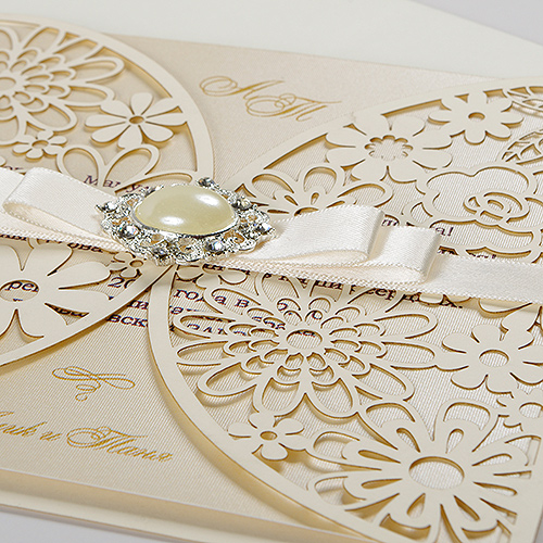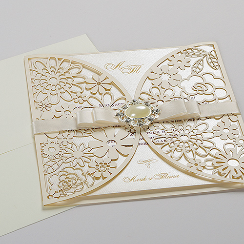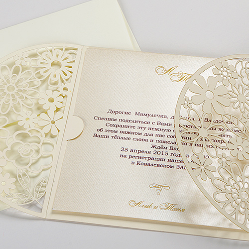 Представляємо вашій увазі найкрасивіші листівки. Квіткове мереживне різьблення двох стулок, що відкриваються, надає незвичайну ніжність і елегантність запрошенню. Філігранна лазерна висічка виконана на найвищому рівні. Використовується щільний дизайнерський папір кольору Ivory. Всередину вкладається красива перламутрова текстурна вкладка, на яку наноситься текст запрошення. У цій листівці вкладка витягується зверху.