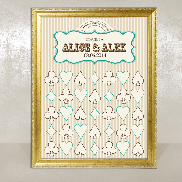 Для гарного комплекту ми підібрали рамки двох розмірів: 30*40 см і 10*15 см. У великій рамці ви отримаєте вашу картину, а в маленькій – пояснювальну табличку. Вже після весілля в цю маленьку рамочку ви вставите ваше весільне фото і повісите поруч із картиною побажань на стіну, вийде чудовий комплект та приємний спогад про чудовий весільний день.