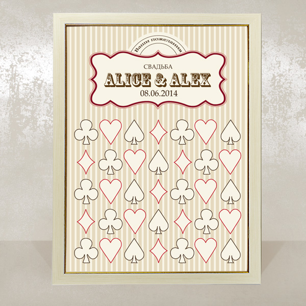 Для гарного комплекту ми підібрали рамки двох розмірів: 30*40 см і 10*15 см. У великій рамці ви отримаєте вашу картину, а в маленькій – пояснювальну табличку. Вже після весілля в цю маленьку рамочку ви вставите ваше весільне фото і повісите поруч із картиною побажань на стіну, вийде чудовий комплект та приємний спогад про чудовий весільний день.
