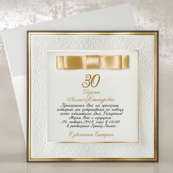 Перед Вами листівка, яку ми назвали “Класична витонченість”. Це по-справжньому витончена листівка з тонким і ніжним візерунком. Колір листівки – молочно-білий. Внутрішній квадрат обрамлений тонкою золотою смужкою з фольги, зовнішній край листівки обрамлений кольоровою рамочкою чорного шоколаду з подвійною золотою фольгованою поличкою на ній. Листівка двошарова: верхня частина – це матова напівпрозора калька, на якій буде надруковано текст. Це ювілейне привітання декорується англійським бантом будь-якого кольору як за участю брошки, так і без неї.