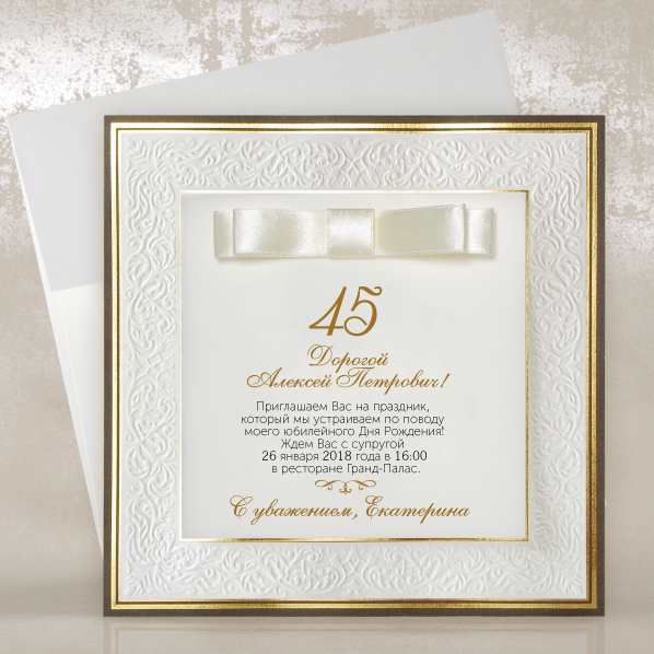 Перед Вами листівка, яку ми назвали “Класична витонченість”. Це по-справжньому витончена листівка з тонким і ніжним візерунком. Колір листівки – молочно-білий. Внутрішній квадрат обрамлений тонкою золотою смужкою з фольги, зовнішній край листівки обрамлений кольоровою рамочкою чорного шоколаду з подвійною золотою фольгованою поличкою на ній. Листівка двошарова: верхня частина – це матова напівпрозора калька, на якій буде надруковано текст. Це ювілейне привітання декорується англійським бантом будь-якого кольору як за участю брошки, так і без неї.