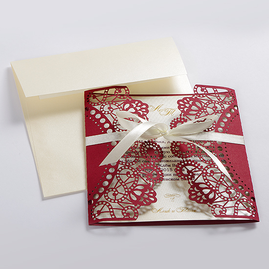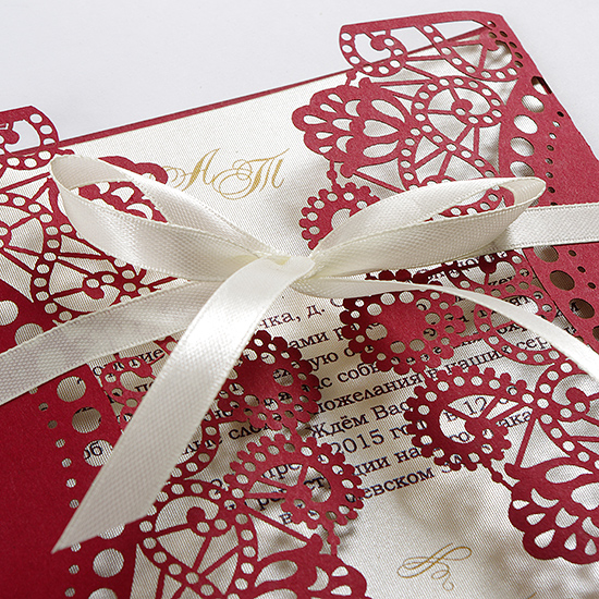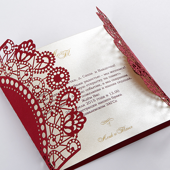 Представляємо вашій увазі найкрасивіші листівки. Квіткове різьблення двох мереживних стулок, що відкриваються, надає незвичайну ніжність і елегантність запрошенню. Філігранна лазерна висічка виконана на найвищому рівні. Використовується щільний дизайнерський папір трендового цього сезону кольору – Marsala. Красивим елементом є перламутрова вкладка кольору айворі, на який наноситься текст запрошення. Милим доповненням є атласна стрічка в тон, яка з’єднує вкладки листівки елегантним вузлом.