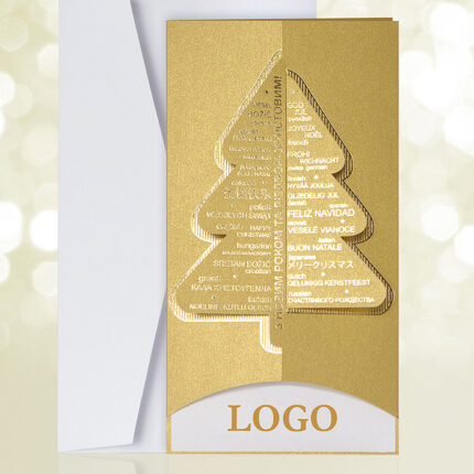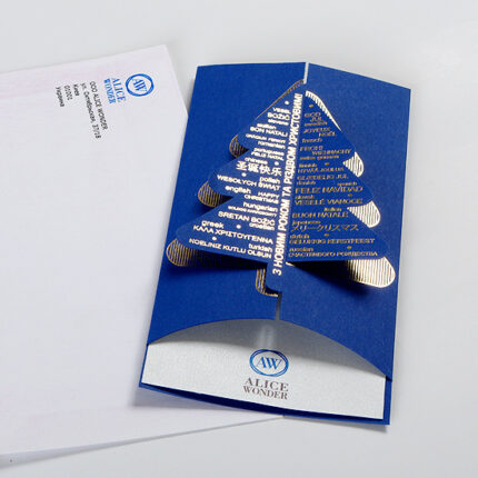 Корпоративна новорічна листівка під назвою “Інтернаціональне привітання” – це унікальна та єдина у своєму роді розробка. Ялинка усіяна новорічними привітаннями, написаними 25 мовами світу і водночас є застібкою листівки. Нижня частина листівки висічена у формі снігового кучугура за рахунок чого виходить, що лого компанії, надруковане з текстом на вкладиші, видно навіть у закритому вигляді.