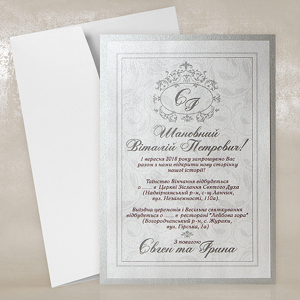 Візерунок у стилі Дамаск взятий за основу цих весільних запрошень, які виконані зі сріблястого перламутрового паперу та срібного дизайнерського картону. Класичні весільні запрошення завжди залишаються у тренді. Поле для тексту з фоном у вигляді vintage монограми. Ці класичні весільні запрошення можна купити лише у нас!