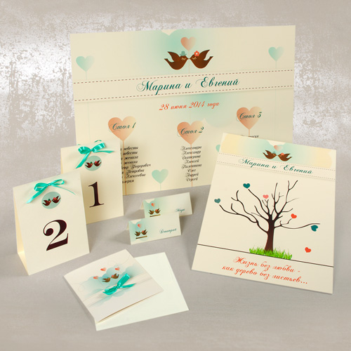 Тема закоханих пташок представлена ​​цьому плані. Вона чудово доповнить вашу весільну поліграфію із цієї ж серії.