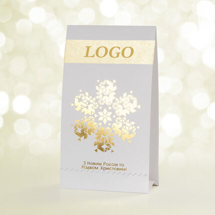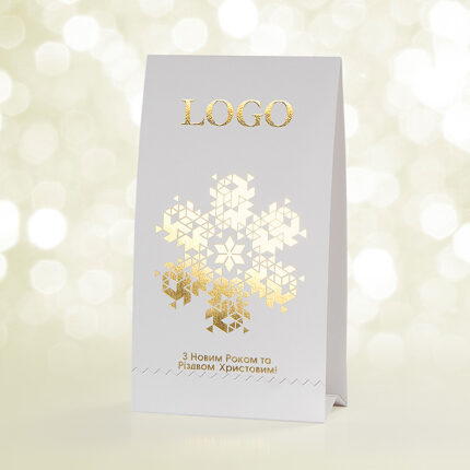 Оригінальна корпоративна новорічна листівка-календарик – виконана з дизайнерського картону з нанесенням золотою або срібною фольгою стилізованої графічної сніжинки.