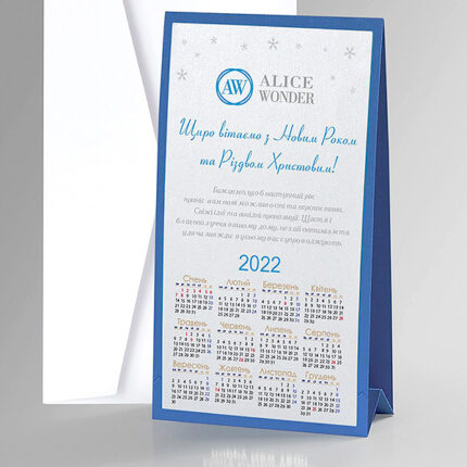 Оригінальна корпоративна новорічна листівка-календарик – виконана з дизайнерського картону з нанесенням золотою або срібною фольгою стилізованої графічної сніжинки.