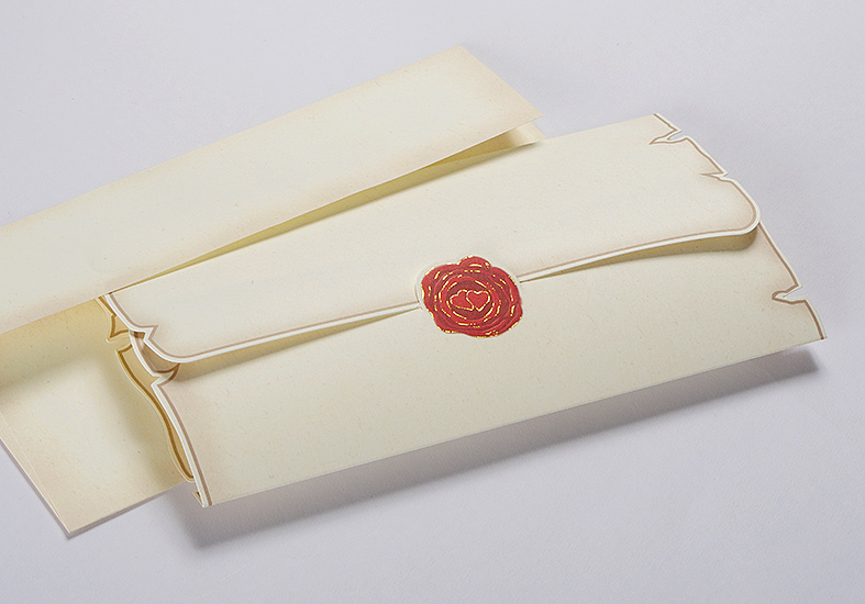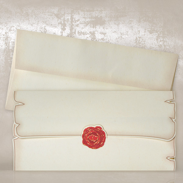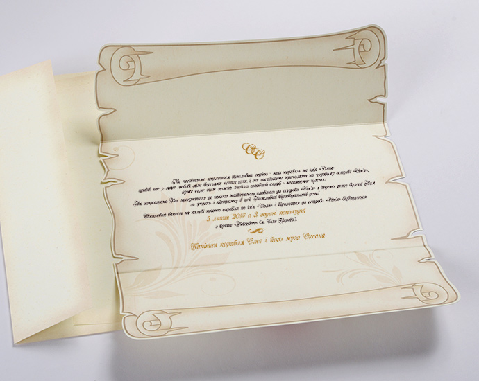 Magic Letter – це оригінальне весільне запрошення у вигляді старовинного листа, скріпленого “сургучною” печаткою. Листівка виконана з матового щільного паперу, який тонований під старий сувій. Стулки листівки розкриваються і ми бачимо надрукований всередині текст запрошення та імітацію згорнутого сувого з нерівними краями. На цьому весільному запрошенні можна розмістити досить великий обсяг тексту. Такий самий тонований конверт додається.