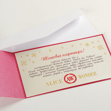 У вартість листівки не входить вартість конверта, друку на листівці, вкладці та конверті. Докладніше про види друку та вартість друку та тиснення логотипу фольгою можна дізнатися тут: Друк на новорічних корпоративних листівках.