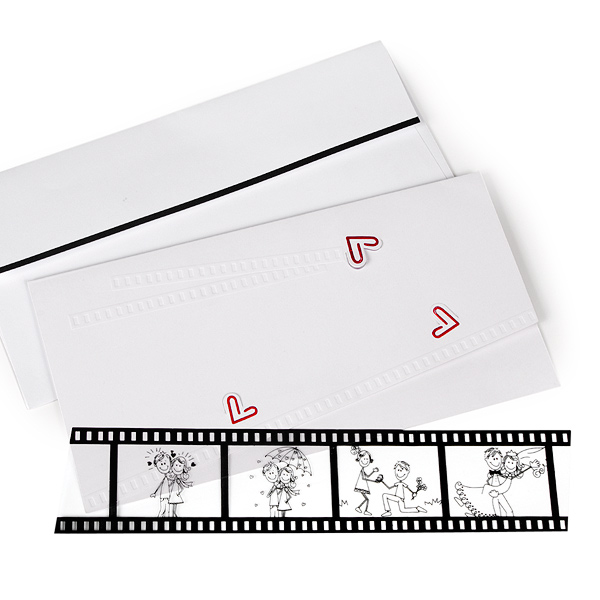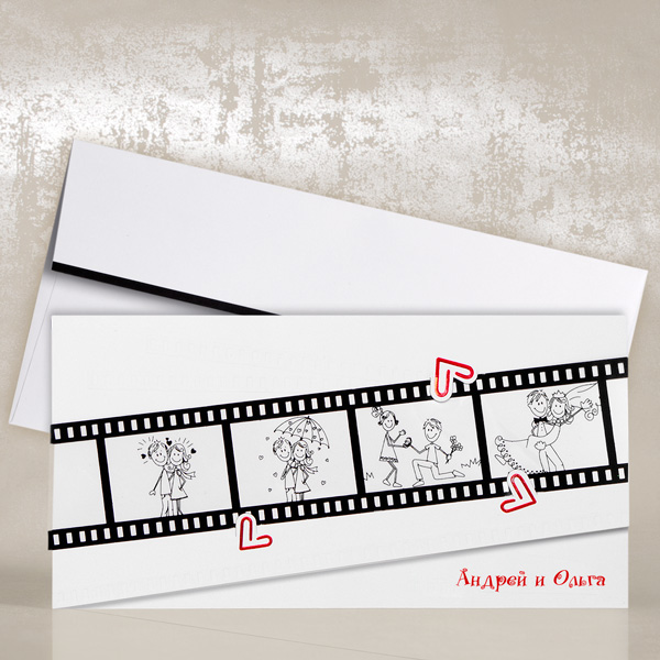Це наша історія: Ми зустрілися та покохали один одного з першого погляду. У будь-якій ситуації, коли ми разом – ми щасливі: навіть коли йде дощ, нам здається, що це не крапельки, а крихітні серця обсипають нас своїм коханням. І ось ми одружуємося! Подивіться нашу історію на цій плівці та порадійте за нас. Ось таке посилання йде від запрошень на весілля Our Love Story, які недарма відкривають наш каталог Прикольних запрошень на весілля. До фронтальної частини листівки за допомогою висічених сердечок кріпиться справжнісінька плівка з вищеописаними сюжетами.