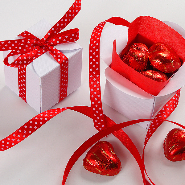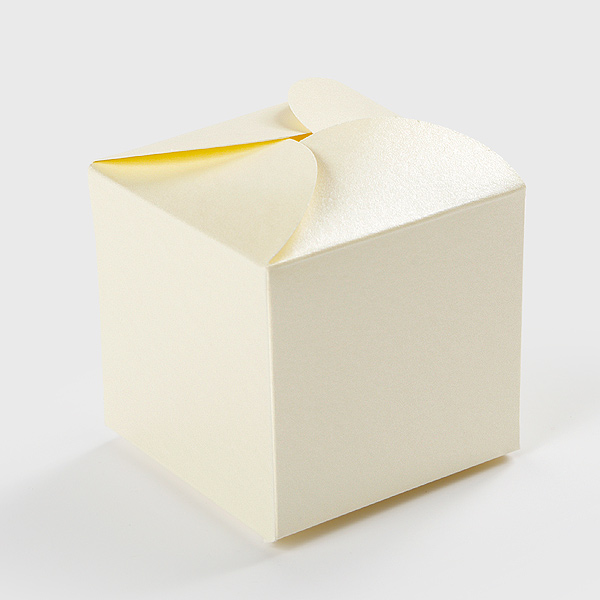 Коробочка-бонбоньєрка виконана у вигляді кубика. Верх кубика зроблений незвичайно і нагадує пелюстки квітки і відмінно виглядає навіть без декоративної стрічки. Бонбоньєрка виготовлена з дизайнерського перламутрового паперу вишуканого кольору Ivory.