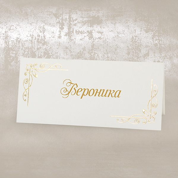 Ці чудові посадкові картки виконані з білого перламутрового щільного картону. Картки прикрашені золотим опуклим орнаментом із золотої фольги по кутках. Друк імені вашого гостя на картці здійснюється безкоштовно!