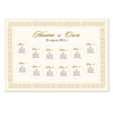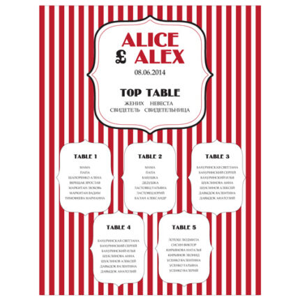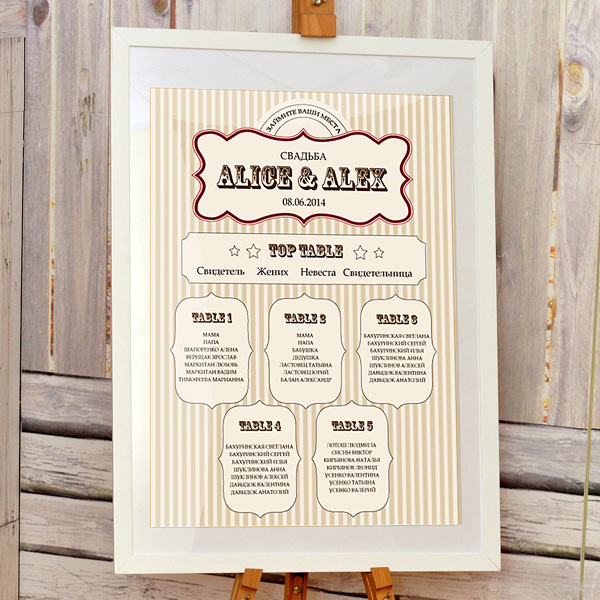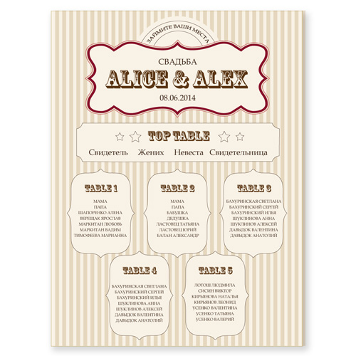 Пропонуємо Вам план розсадки для тематичного весілля або свята в стилі гангстера, виконаний на матовому дизайнерському папері кольору айворі. Оригінальний смугастий фон, а в центрі велика виразна віньєтка, де розміщуються імена молодят та дата весілля. Столи розміщуються нижче за порядком або імітуючи розміщення в залі. Ми можемо зробити таку схему розсаджування в будь-якому кольорі, тільки напишіть нам ваші побажання.