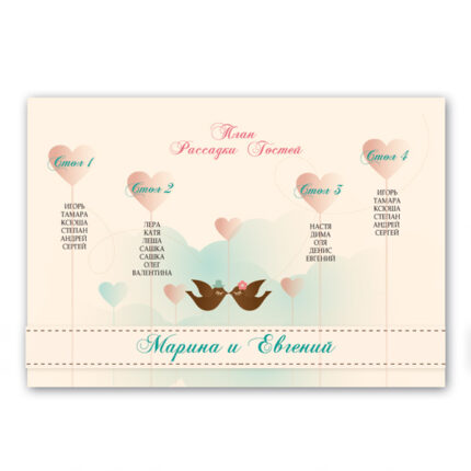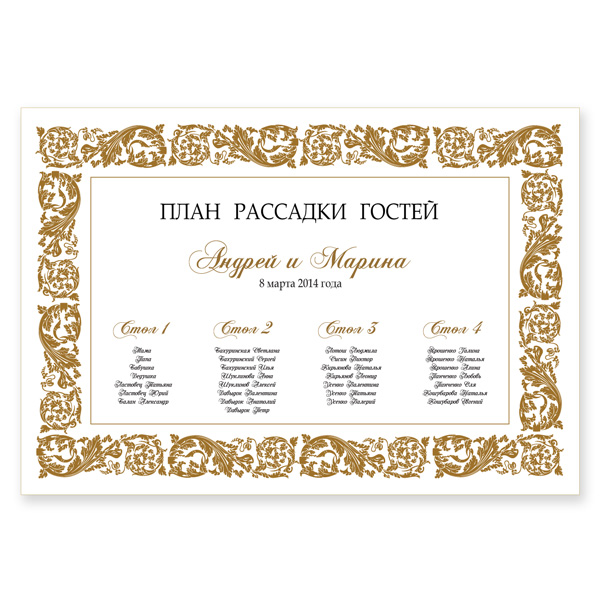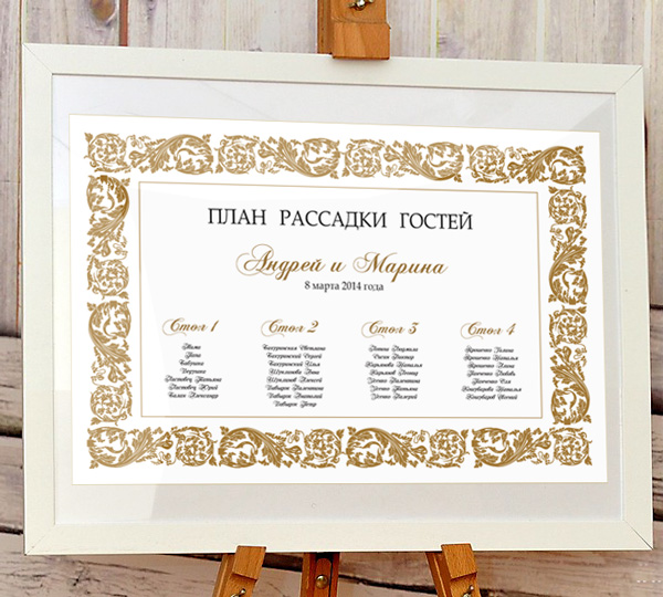 Пропонуємо Вам план розсаджування Vintage White, виконаний на матовому білому папері. План прикрашений масивною vintage кадр з золотим візерунком. У центрі розміщуються імена молодят та дата весілля, столи розміщуються нижче по порядку або імітуючи розстановку в залі. Ми можемо зробити таку схему розсаджування в будь-якому кольорі, тільки напишіть нам ваші побажання.