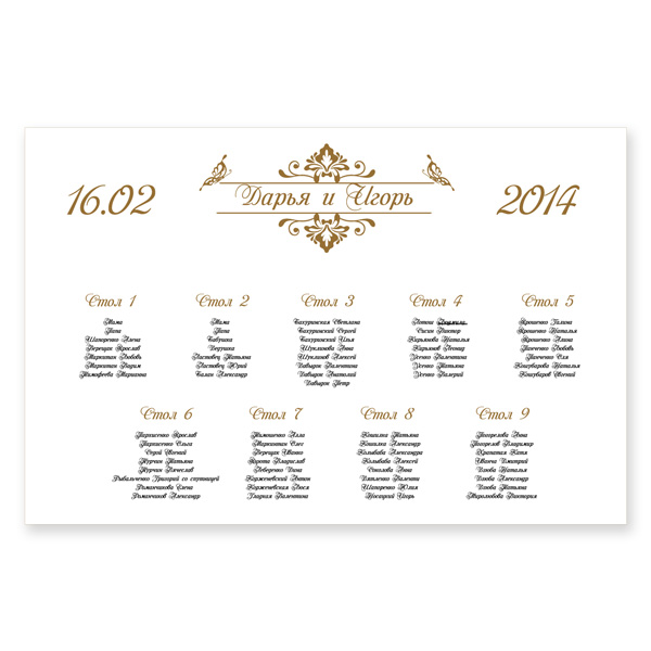 Пропонуємо Вам план розсадки Plan №9. Gold Butterfly, виконаний на матовому білому папері. На плані головним акцентом є імена молодят та дата весілля. Зверніть увагу, що списки гостей можуть бути оформлені за різним принципом: згруповані по столах, або в алфавітному порядку.