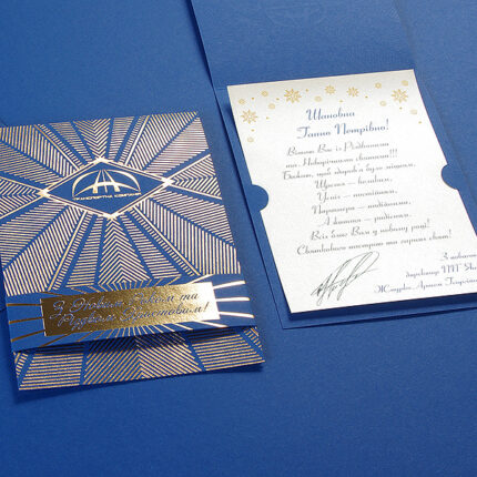 Вишукана корпоративна листівка-конструктор з ексклюзивним дизайном для привітання з Новим роком та Різдвом! Замовивши у нас корпоративний вітальний набір, Ви отримаєте зразок ексклюзивної дизайнерської поліграфії представницького класу!