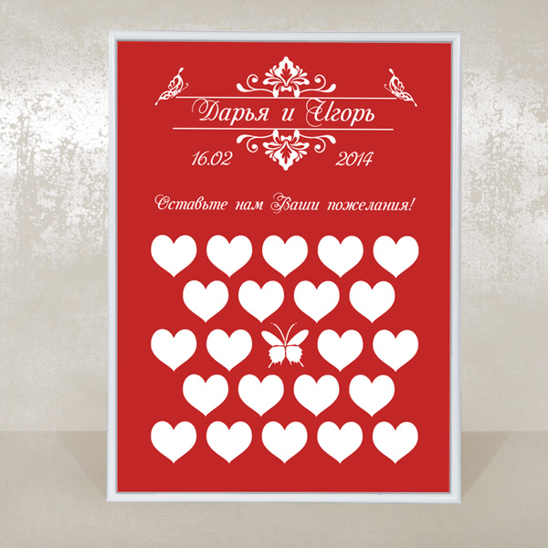 Картина для побажань – це сучасна альтернатива Книзі для побажань. Побажання вписуються вашими гостями в серця. Чим більше у вас гостей, тим більше буде сердець. Картина робиться на замовлення, тому ви можете вибрати будь-яку гаму виконання. Картина з теплими побажаннями потім довгі роки радуватиме вас і нагадуватиме про приємну подію.