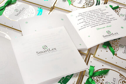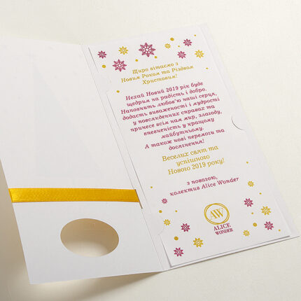 У вартість листівки не входить вартість конверта, друку на листівці, вкладці та конверті. Докладніше про види друку та вартість друку та тиснення логотипу фольгою можна дізнатися тут: Друк на новорічних корпоративних листівках.