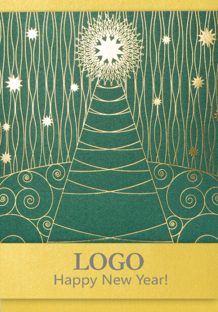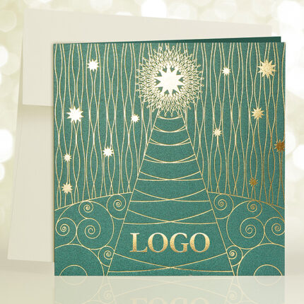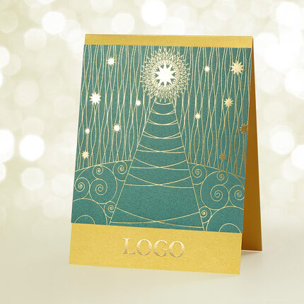 Листівка зроблена у формі книжечки, квадратна форма збалансована. Логотип також розміщується в основі казкової ялинки на фронтальній частині листівки.