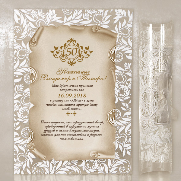 Вітальна листівка Manuscript виконана в одній з найоригінальніших форм – сувій. Футляр для сувої та рамка поздрпалення виконані з акрилу з нанесеним білим квітковим візерунком, внутрішня частина – з перламутрового паперу, на якому нанесено зображення манускрипта. Футляр завершено бантом із органзи. Сувій згортається і складається у футляр.