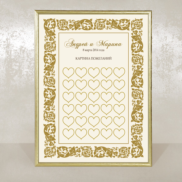 Картина для побажань – це сучасна альтернатива Книзі для побажань. Побажання вписуються вашими гостями в серця. Чим більше у вас гостей, тим більше буде сердець. Картина робиться на замовлення, тому ви можете вибрати будь-яку гаму виконання. Картина з теплими побажаннями потім довгі роки радуватиме вас і нагадуватиме про приємну подію.