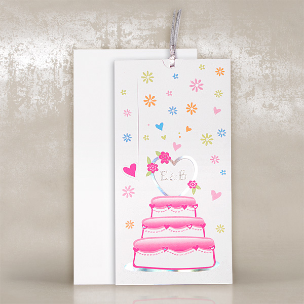 Оригінальне весільне запрошення Wedding Cake, яке зображує багатоярусний весільний торт. На верхівці торта у висіченій ділянці у формі серця видно ініціали молодих, які надруковані разом із текстом весільного запрошення на внутрішньому вкладиші. Потягніть за сріблясту стрічку і текст запрошення з’явиться перед очима. Комплектуються білим конвертом.
