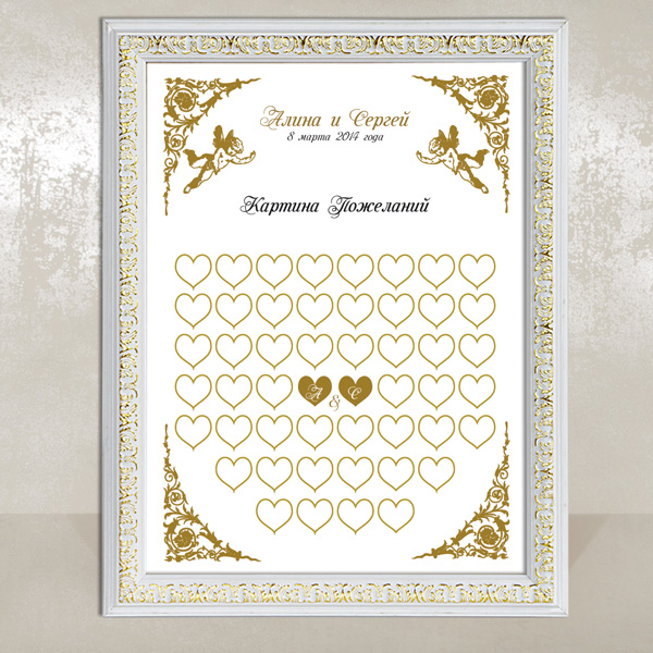 Картина для побажань – це сучасна альтернатива Книзі для побажань. Побажання вписуються вашими гостями в серця. Чим більше у вас гостей, тим більше буде сердець. Картина робиться на замовлення, тому ви можете вибрати будь-яку гаму виконання. Картина з теплими побажаннями потім довгі роки радуватиме вас і нагадуватиме про приємну подію.